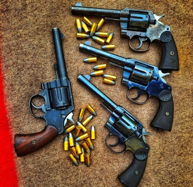 6-зарядные револьверы "COLT NEW SERVICE" с 5,5" стволом под 455 ELEY и "COLT M1917" (слева) с 5,5" стволом под 45АСР.